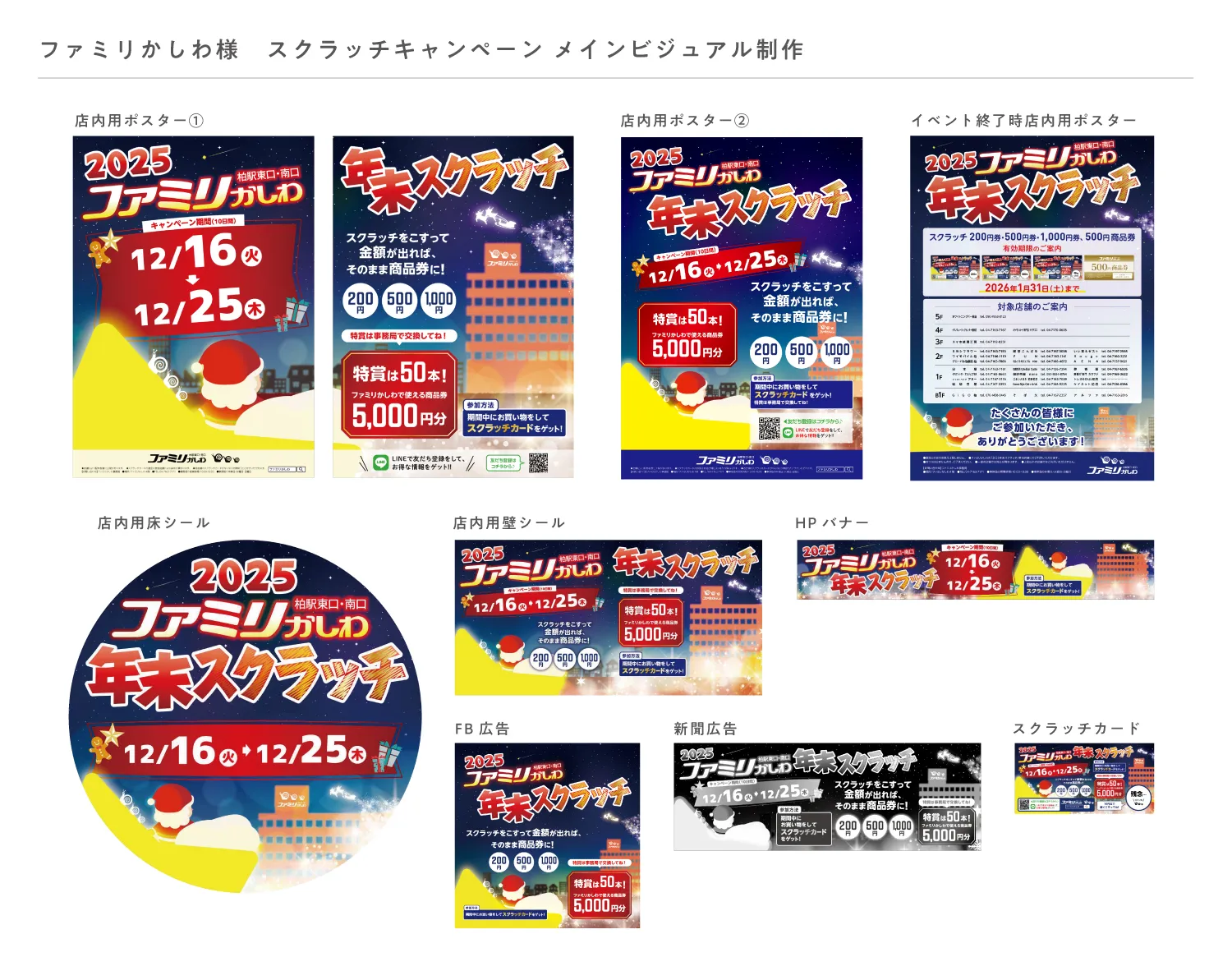 店内用ポスター3点 / 店内用床シール / 店内用壁シール / HPバナー / FB広告 / 新聞広告 / スクラッチカード