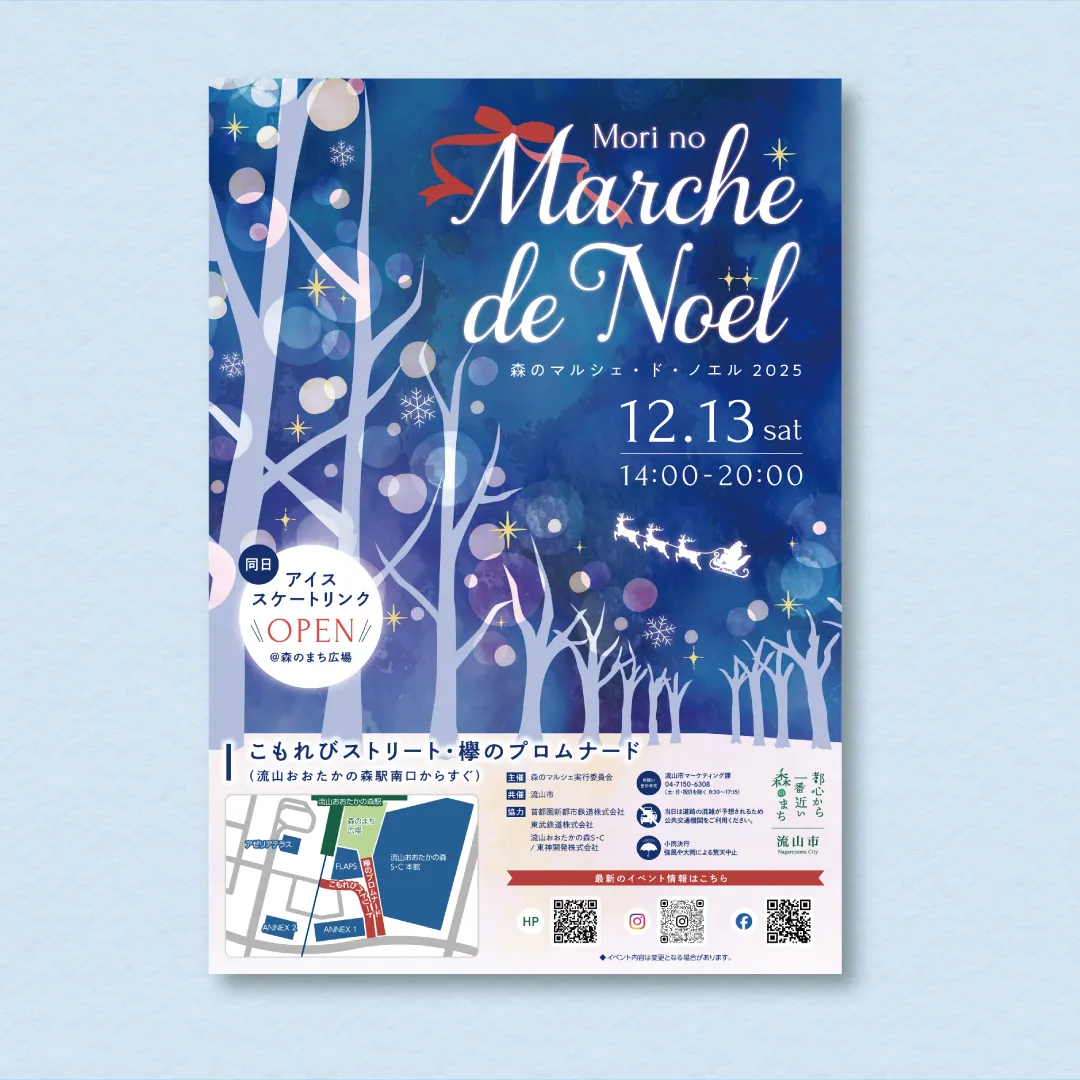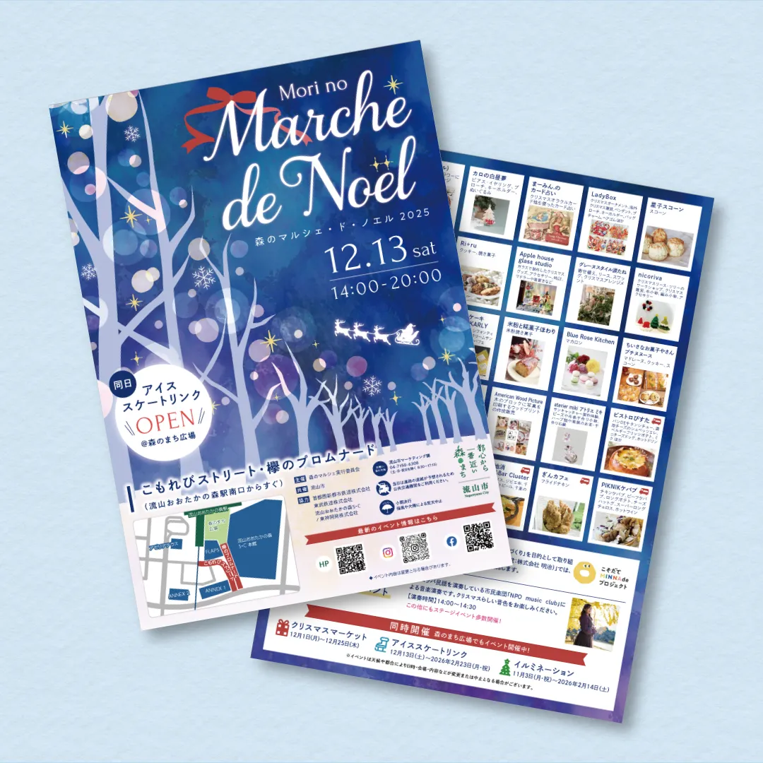 2025年12月13日に流山おおたかの森駅前の広場で開催された「森のマルシェ・ド・ノエル」のポスター・フライヤーのデザイン・印刷をさせていただきました。